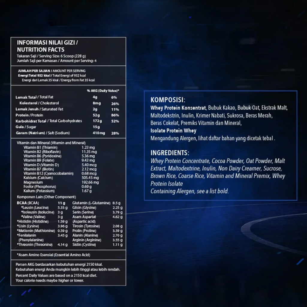 Formula ini menggabungkan whey protein concentrate, whey isolate, oat powder, maltodekstrin, serta rangkaian vitamin dan mineral untuk membantu memenuhi kebutuhan gizi tambahan.