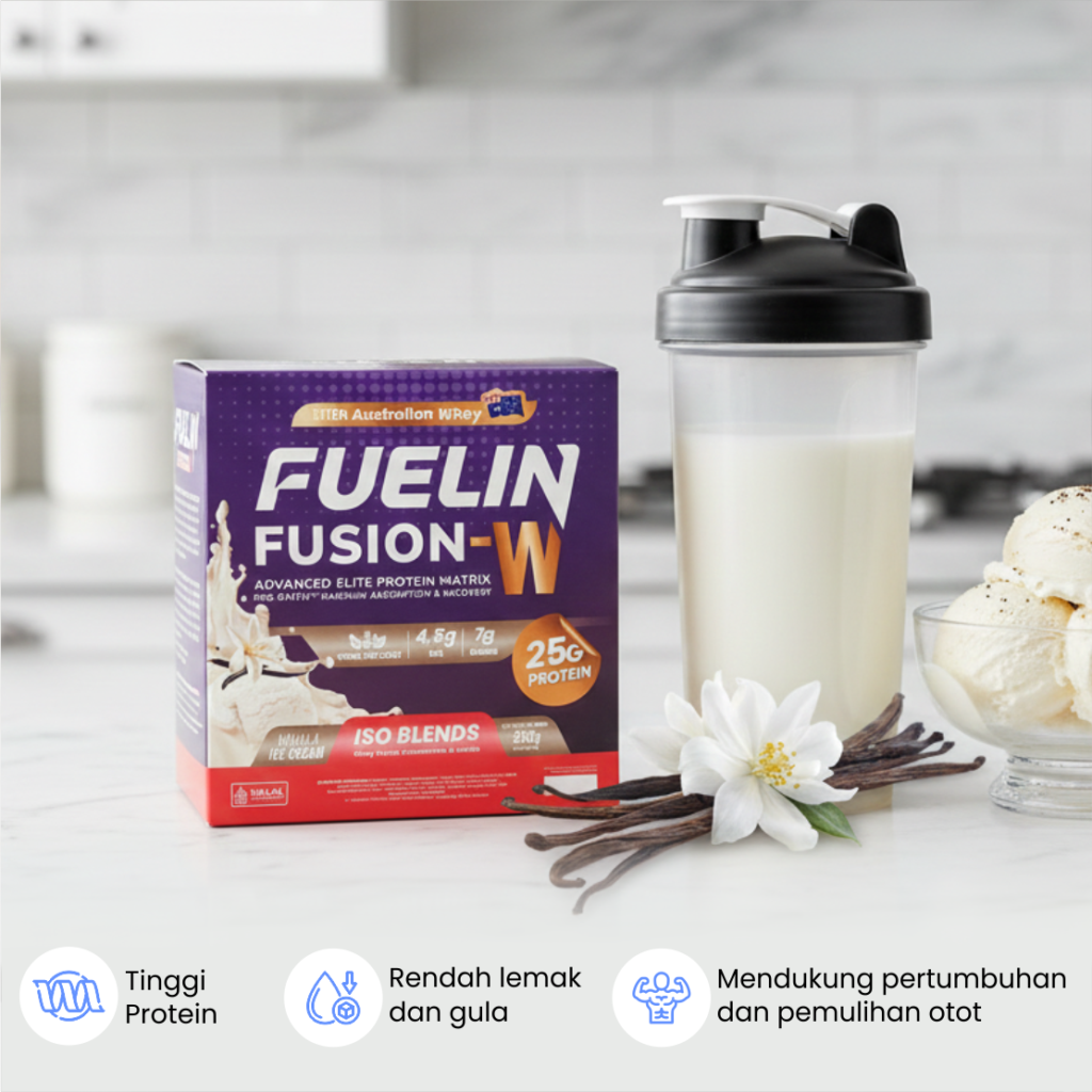Dengan rasa Vanilla Ice Cream yang creamy dan ringan, FUELIN Fusion-W mudah larut, nyaman diminum, dan cocok dikonsumsi kapan saja—baik setelah latihan, sebelum beraktivitas, atau sebagai tambahan nutrisi di siang hari. Kandungan proteinnya membantu menunjang pemulihan otot, mendukung pembentukan massa otot, serta menjaga performa selama latihan.